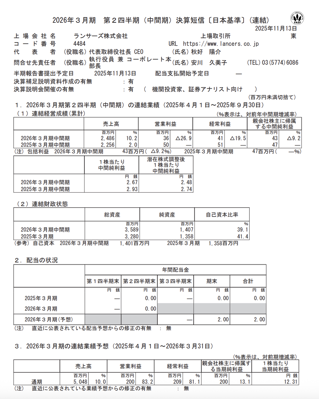 経常利益:21億4400万円(前年同期は▲3100万円)