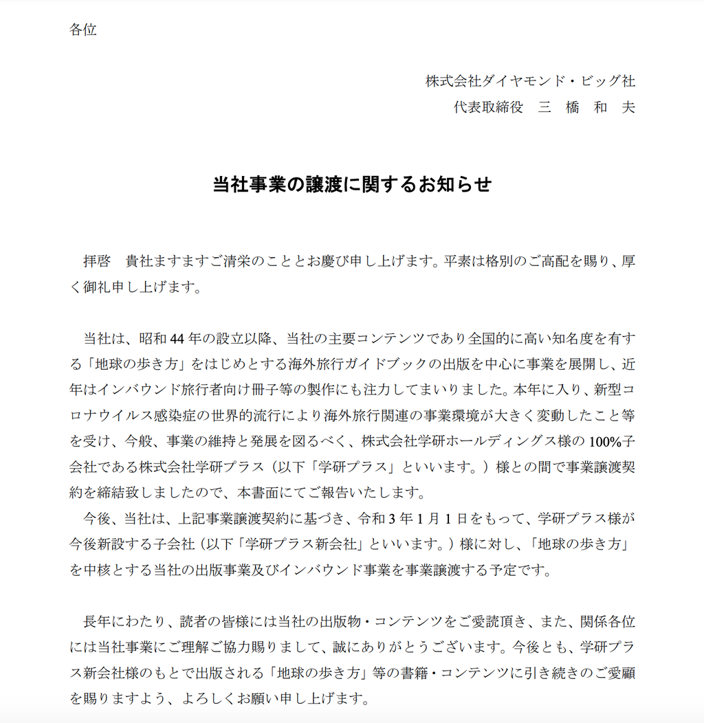 ダイヤモンド・ビッグ社が「地球の歩き方」事業の譲渡を発表した。今年に入り、新型コロナウイルス感染症の世界的流行により海外旅行関連の事業環境が大きく変動したこと等