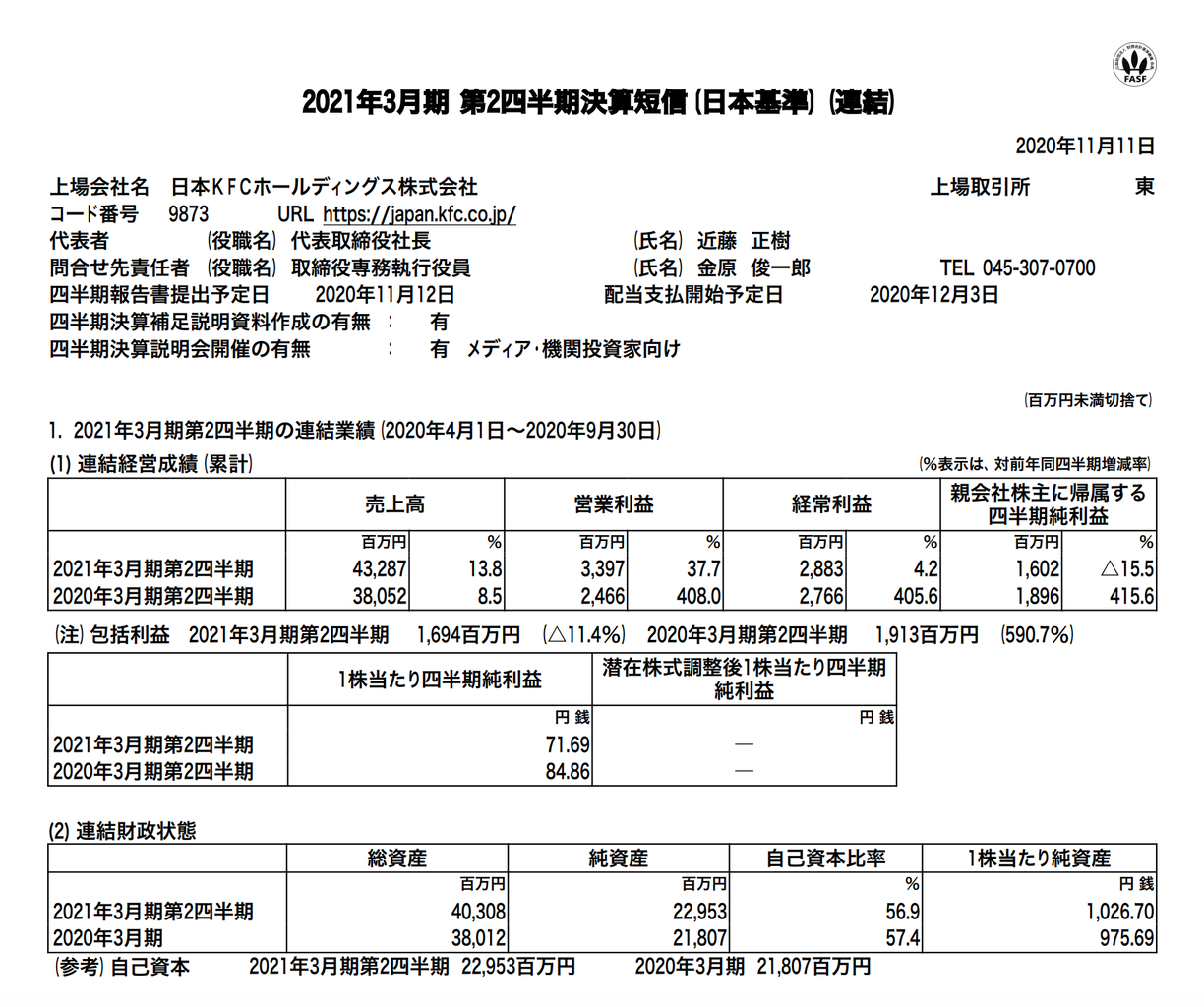 日本KFCホールディングス 2021年3月期第2四半期決算