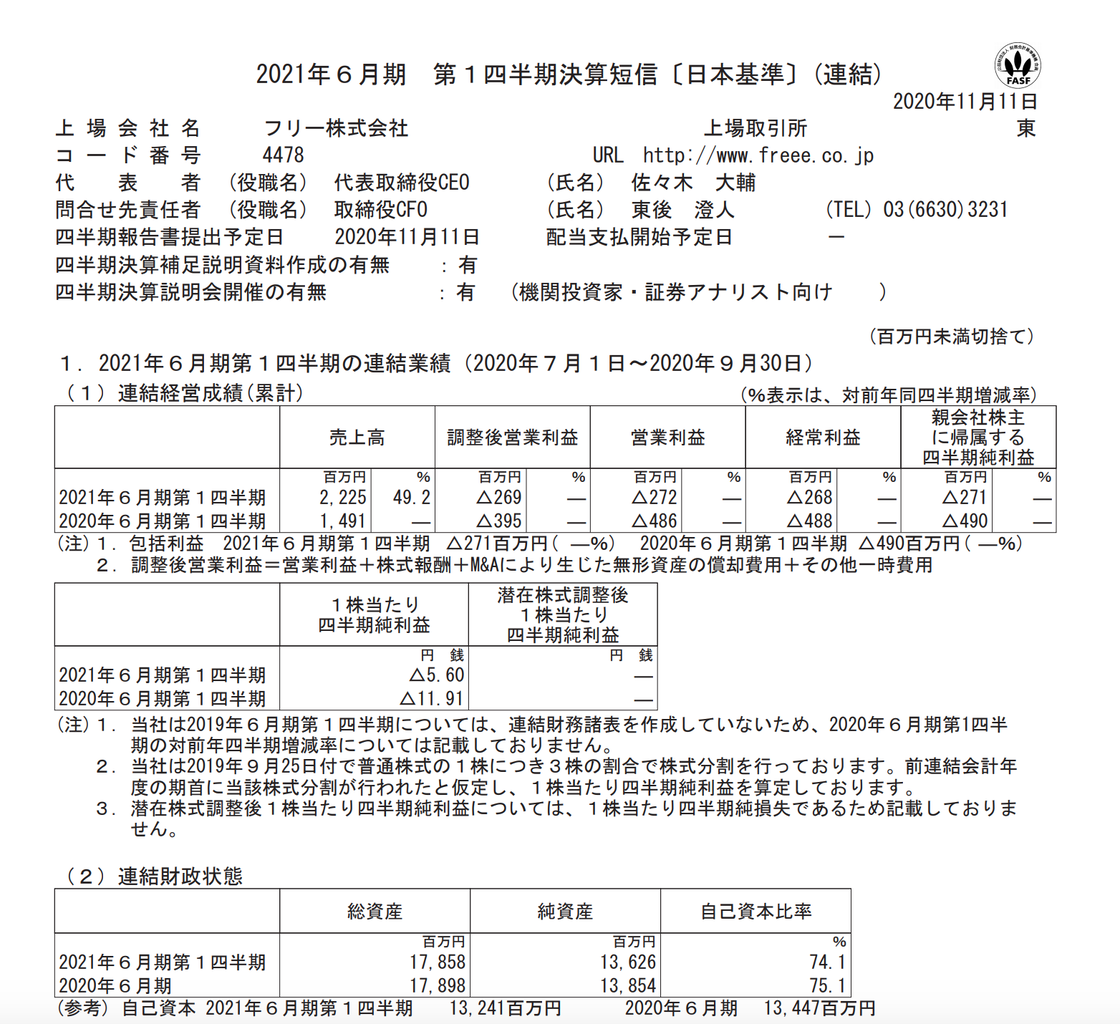 フリー 2021年6月期第1四半期決算