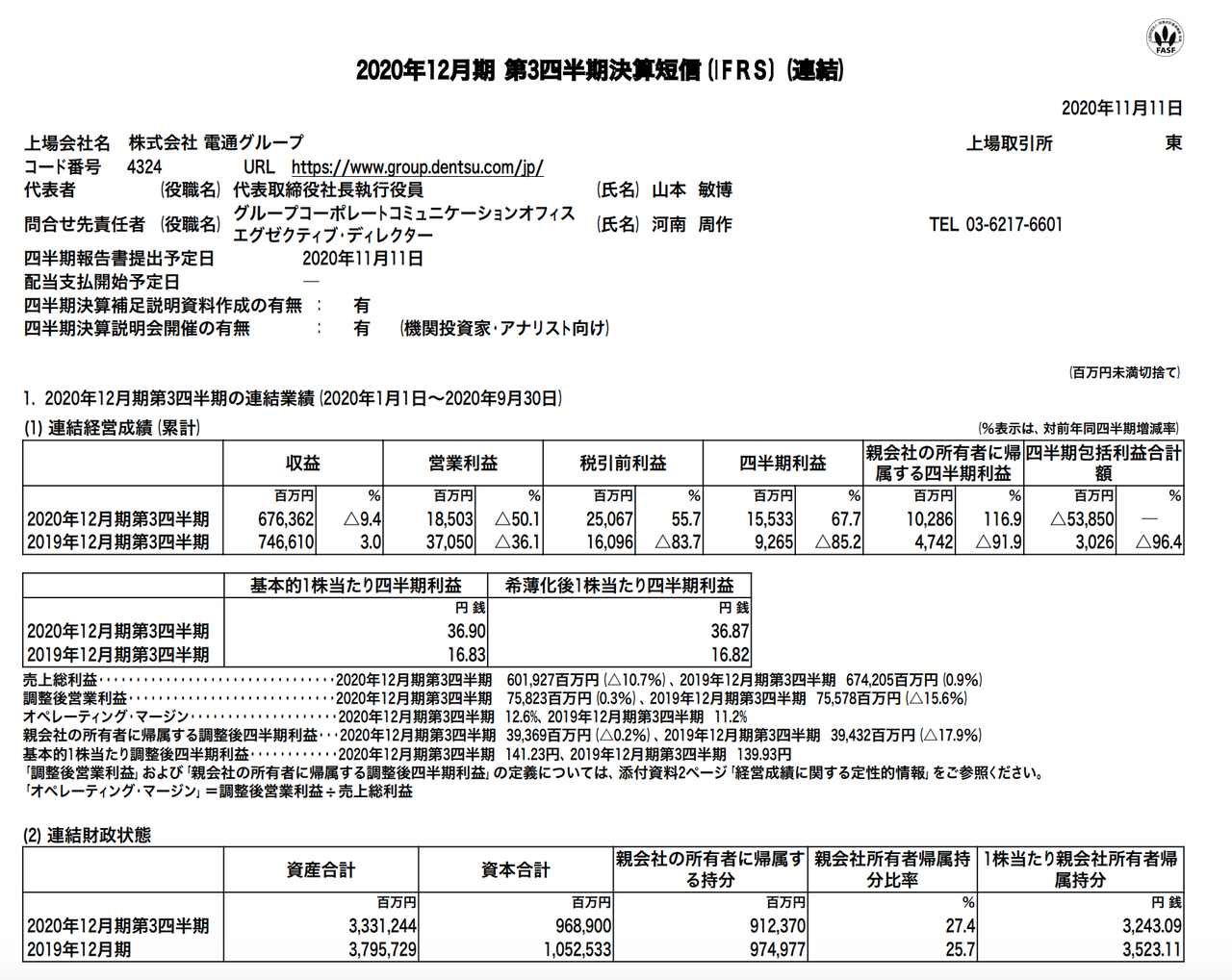 電通グループ 2020年12月期第3四半期決算