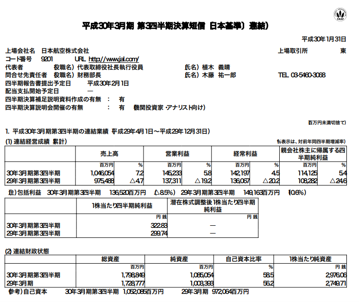 日本航空 2018年3月期第3四半期決算