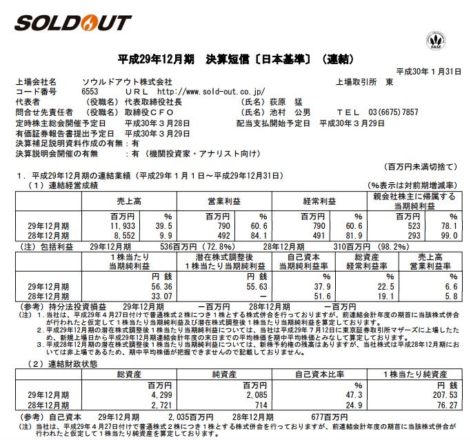 ソウルドアウト 2017年12月期通期決算