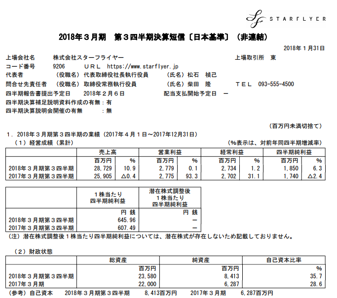 スターフライヤー 2018年3月期第3四半期決算