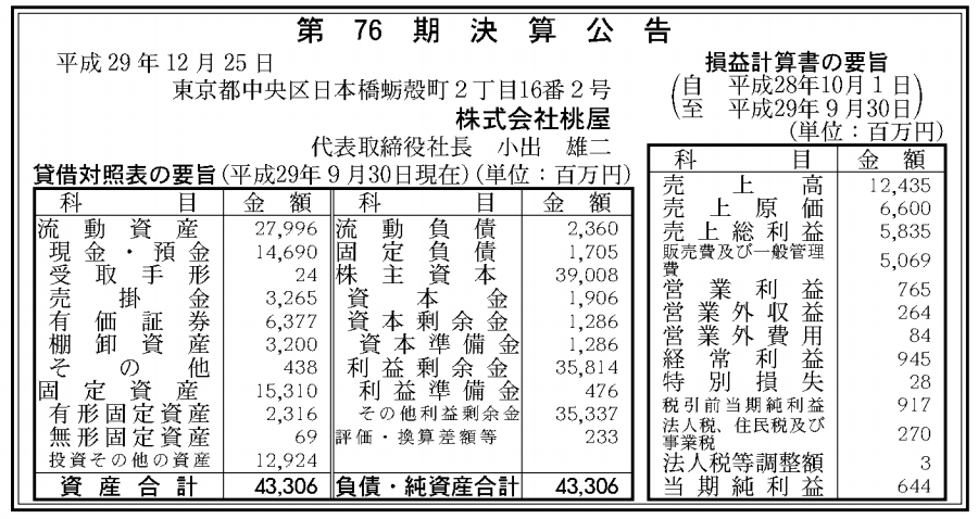 桃屋 決算公告(第76期)