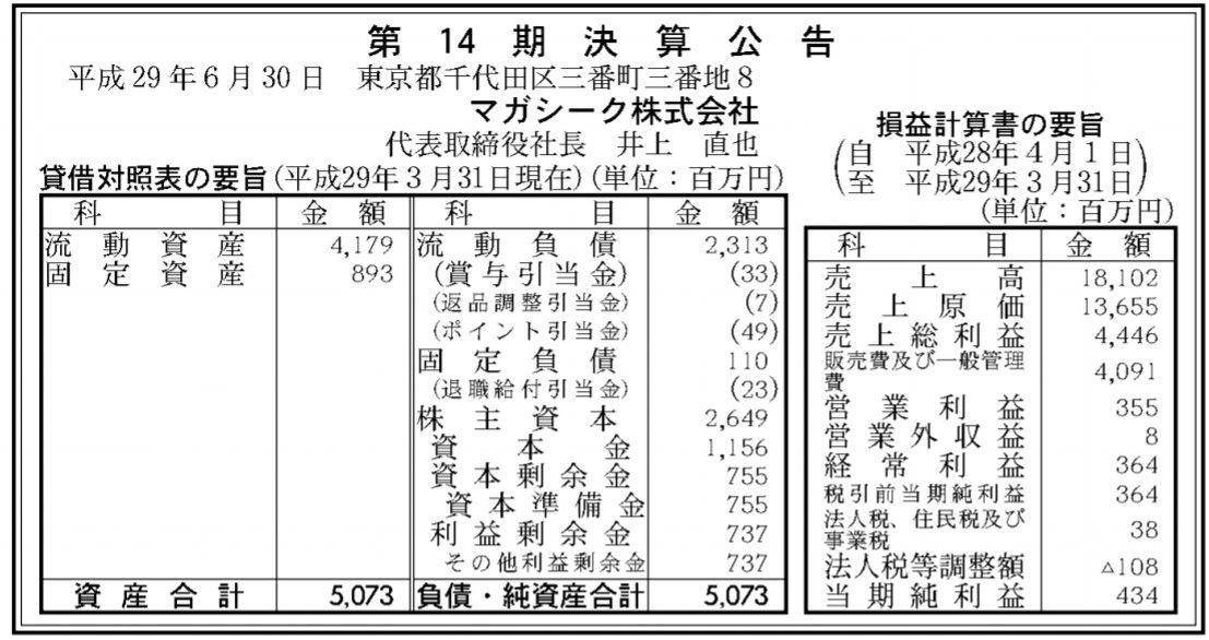 レディースファッション通販「マガシーク」決算公告(第14期)