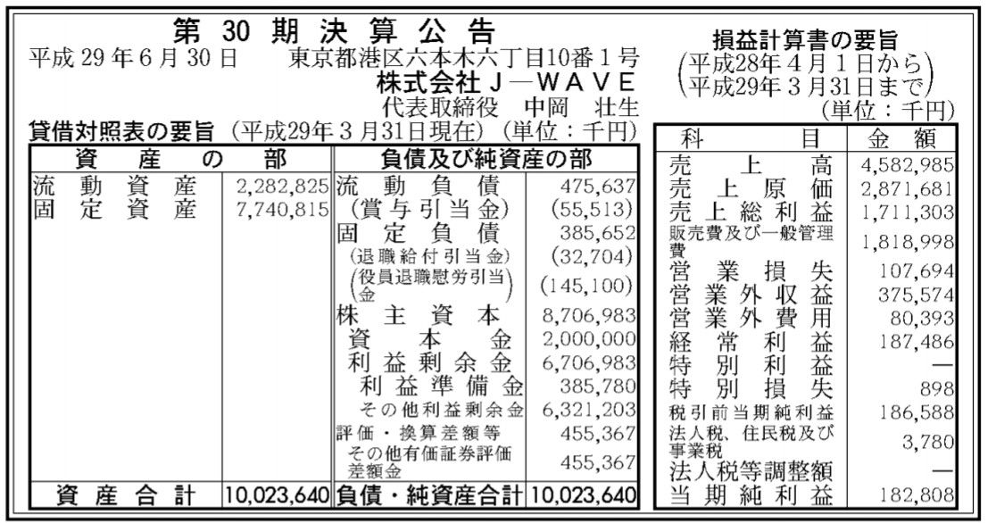 FMラジオ局「J-WAVE」決算公告(第30期)