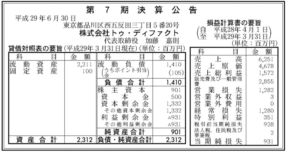 電子書籍サイトhonto等を運営する「トゥ・ディファクト」決算公告(第7期)