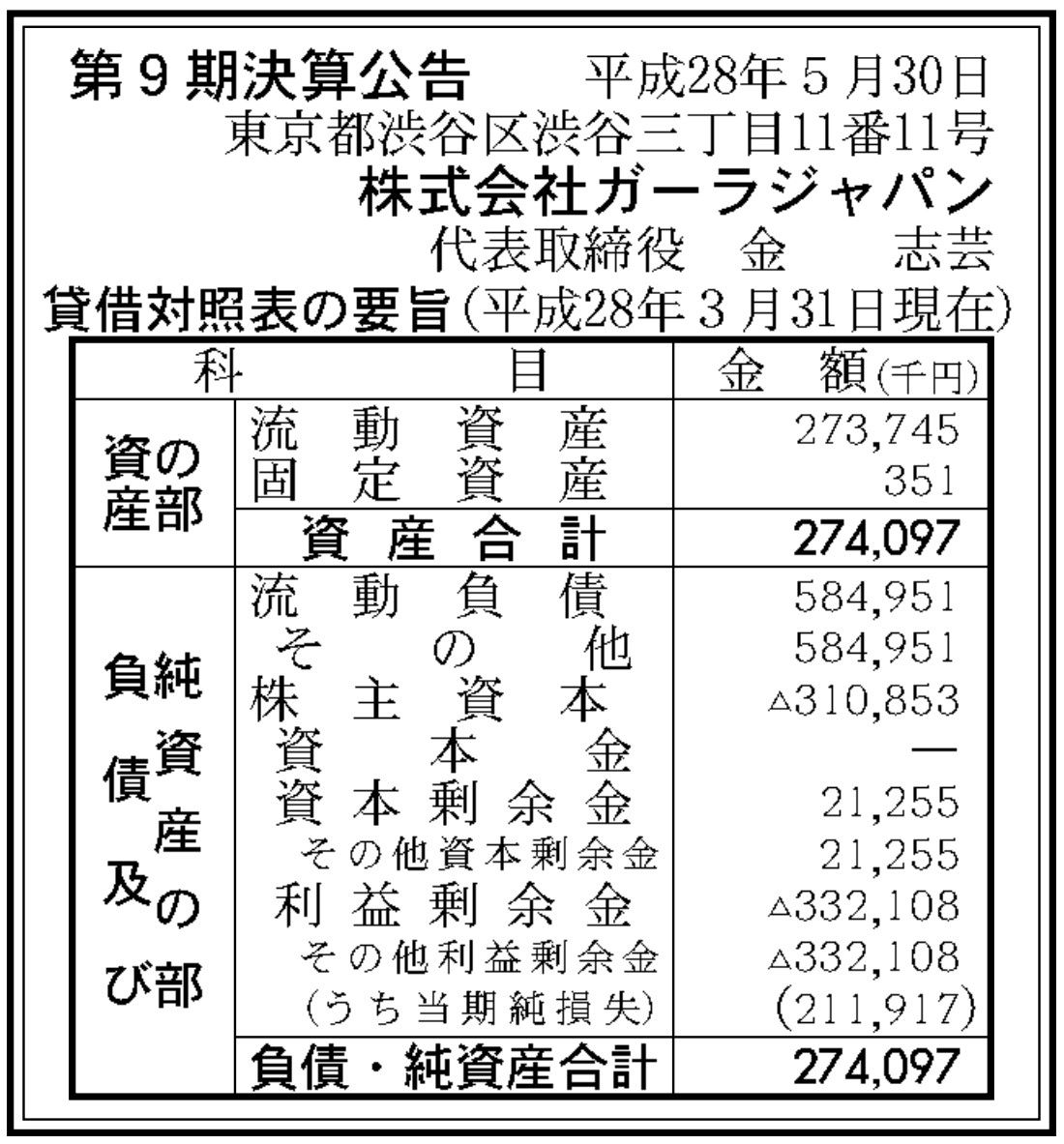 スマホゲーム開発・運営の「ガーラジャパン」決算公告(第9期)