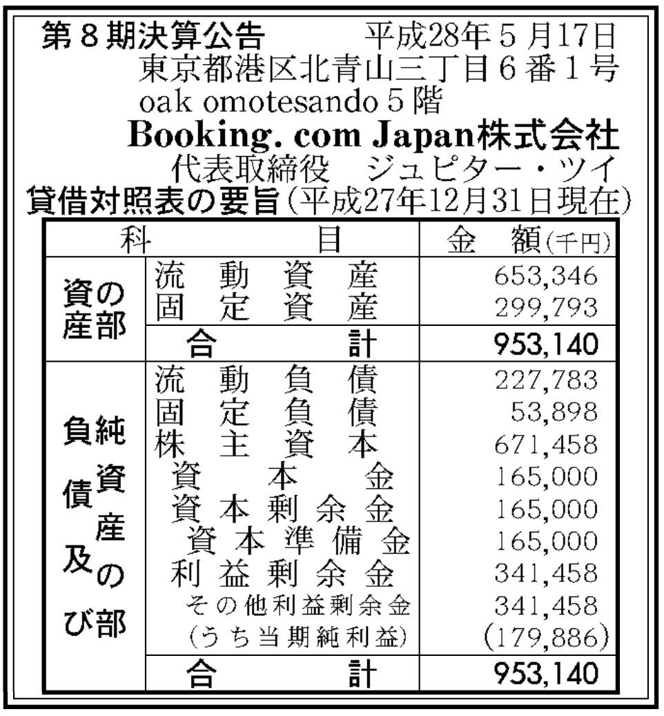 ホテル予約の「Booking.com Japan」決算公告(第8期)