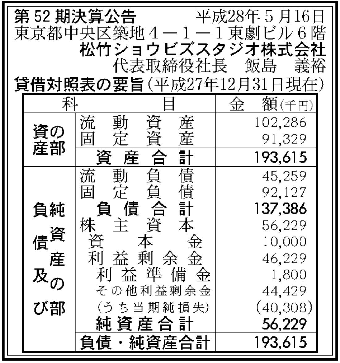 松竹ショウビズスタジオ決算 決算公告(第52期)