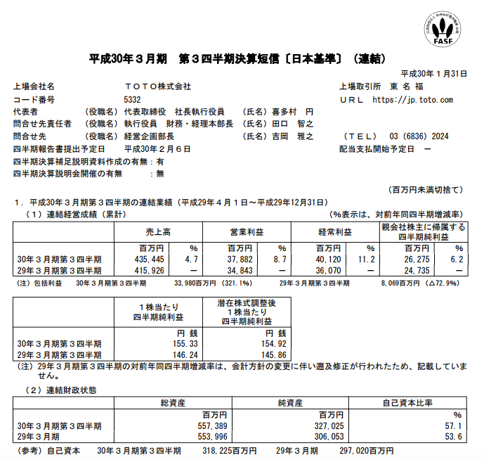 TOTO 2018年3月期第3四半期決算
