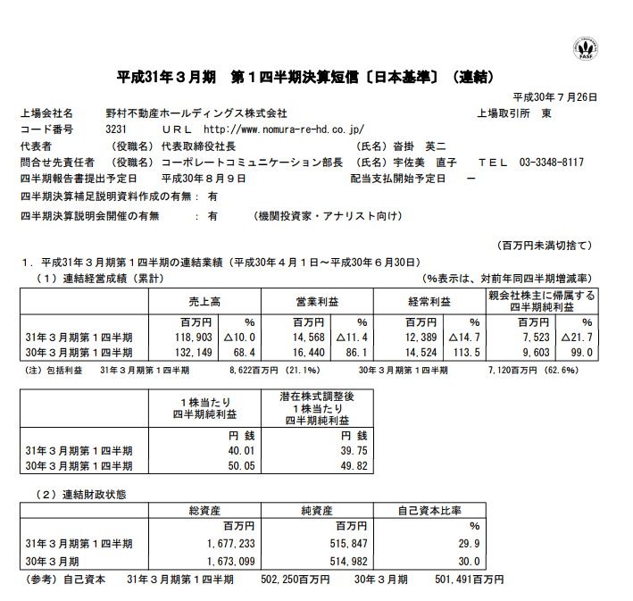 野村不動産HD 2019年3月期第1四半期決算