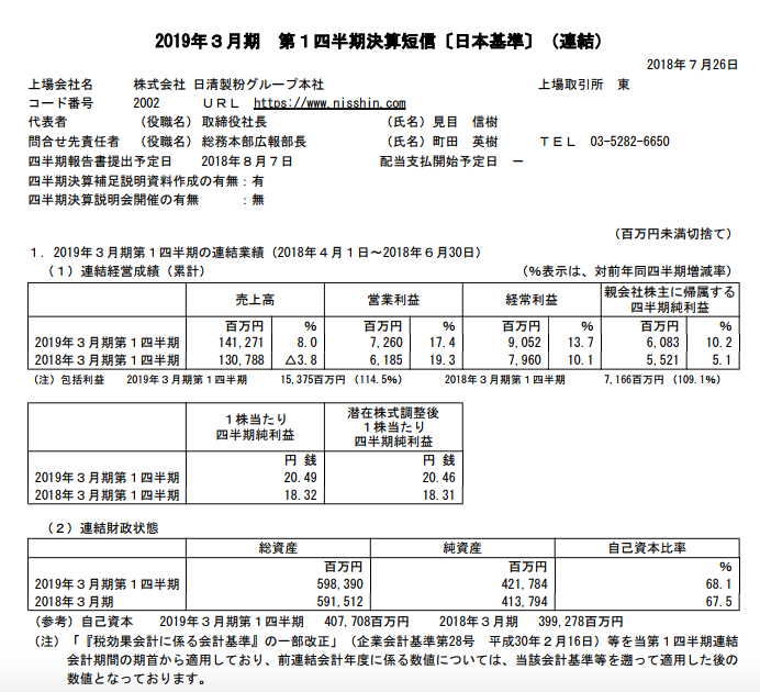 日清製粉グループ本社 2019年3月期第1四半期決算