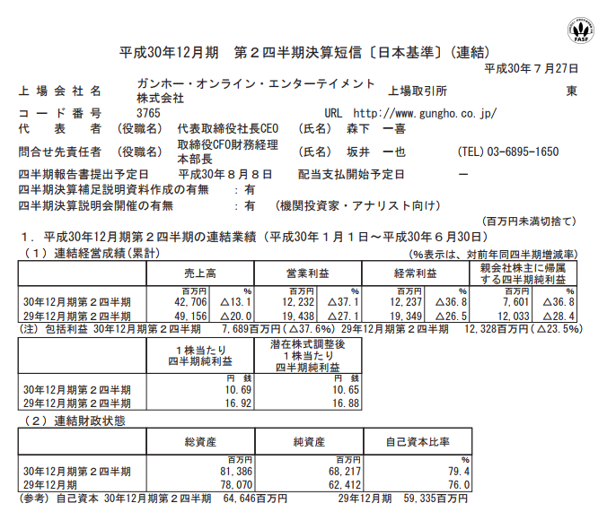 ガンホー・オンライン・エンターテイメント 2018年12月期第2四半期決算