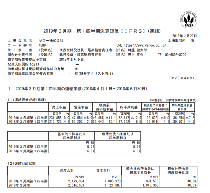 ヤフー 2019年3月期第1四半期決算