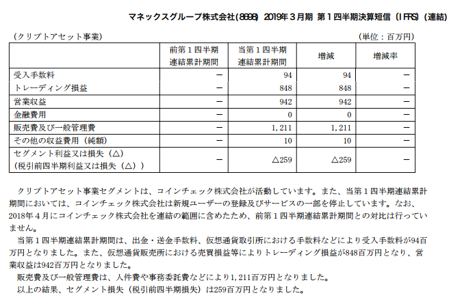 マネックスグループの決算短信より引用。コインチェック株式会社の活動に該当するクリプトアセット事業の業績。