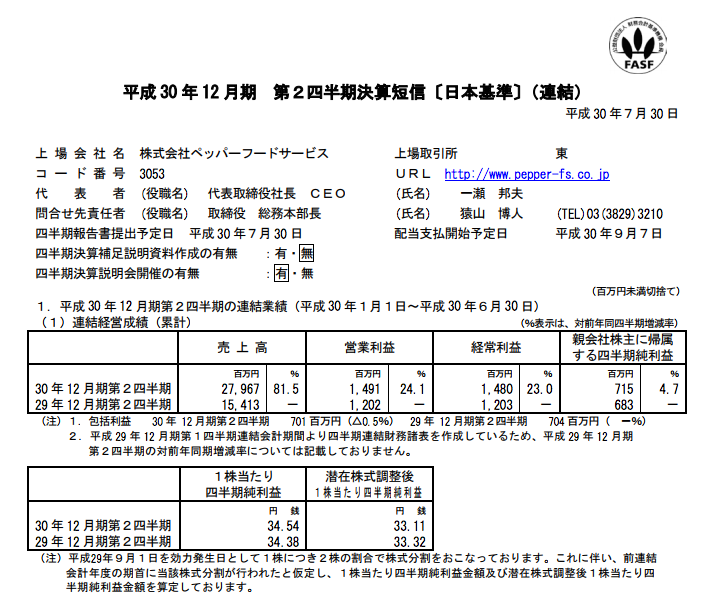 ペッパーフードサービス 2018年12月期第2四半期決算