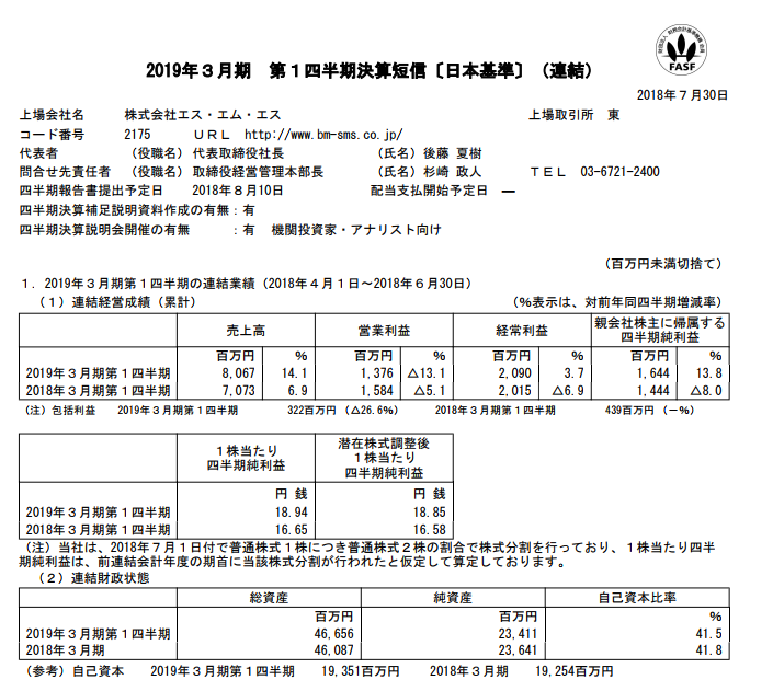 エス・エム・エス 2019年3月期第1四半期決算