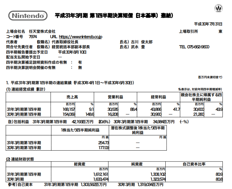 任天堂 2019年3月期第1四半期決算