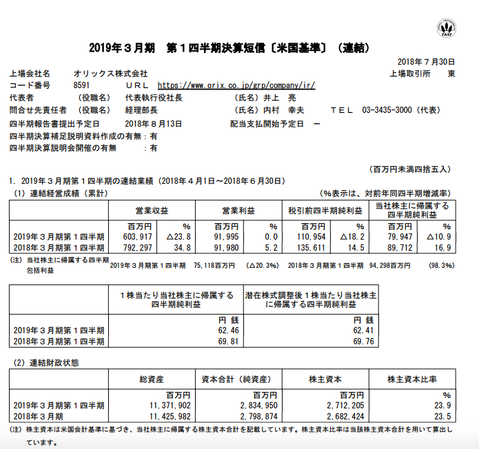 オリックス 2019年3月期第1四半期決算