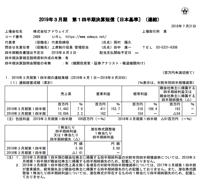 アドウェイズ 2019年3月期第1四半期決算
