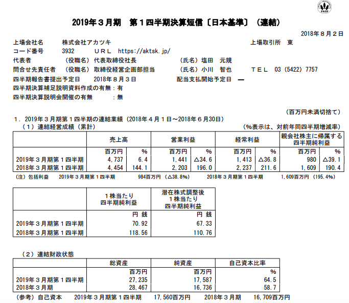 アカツキ 2019年3月期第1四半期決算