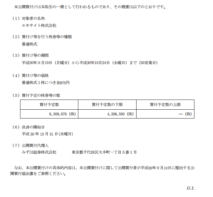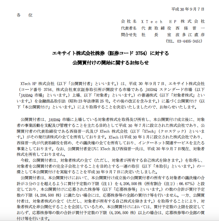 XTechが子会社のXTech HPを通じてエキサイトに対して株式公開買付けを実施