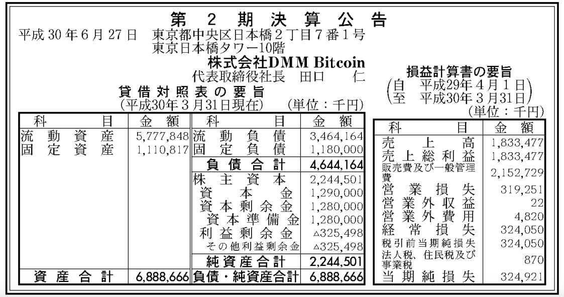 DMMの仮想通貨関連事業「DMMビットコイン」 決算公告(第2期)