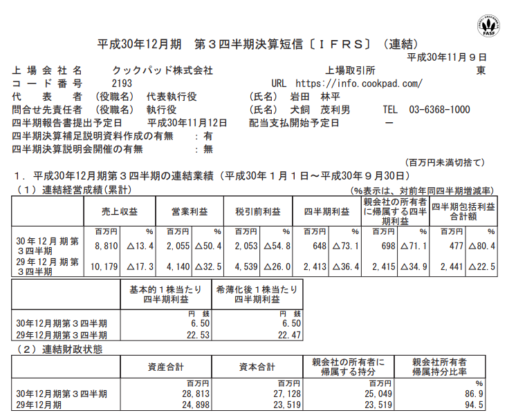 ペッパーフードサービス 2018年12月期第3四半期決算 >