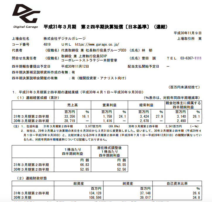 デジタルガレージ 2019年3月期第2四半期決算