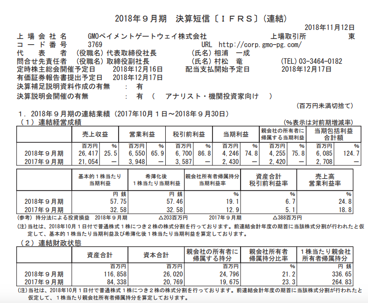 GMOペイメントゲートウェイ 2018年9月期通期決算