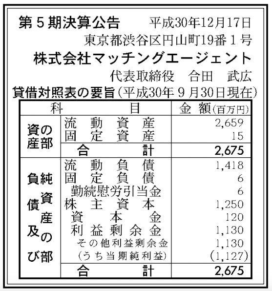 恋活アプリ「タップル誕生」提供の マッチングエージェント 決算公告(第5期)