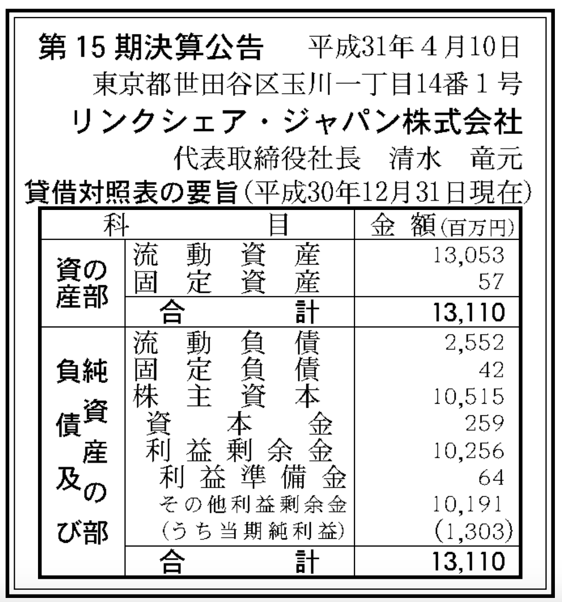 < 楽天西友ネットスーパーマーケティング 決算公告(第1期)