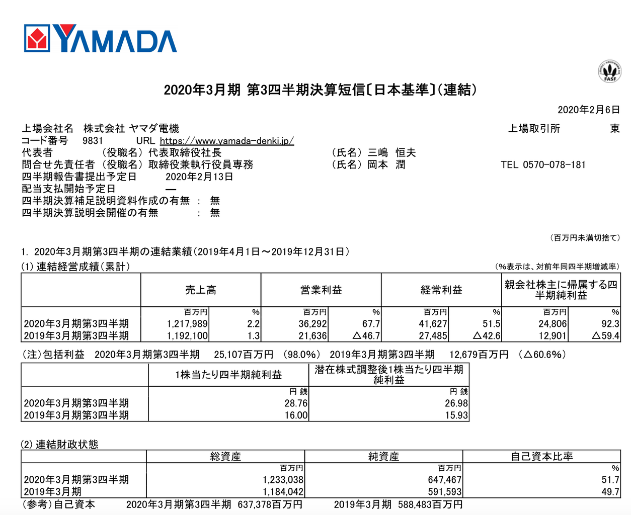 ヤマダ電機 2020年3月期第3四半期決算