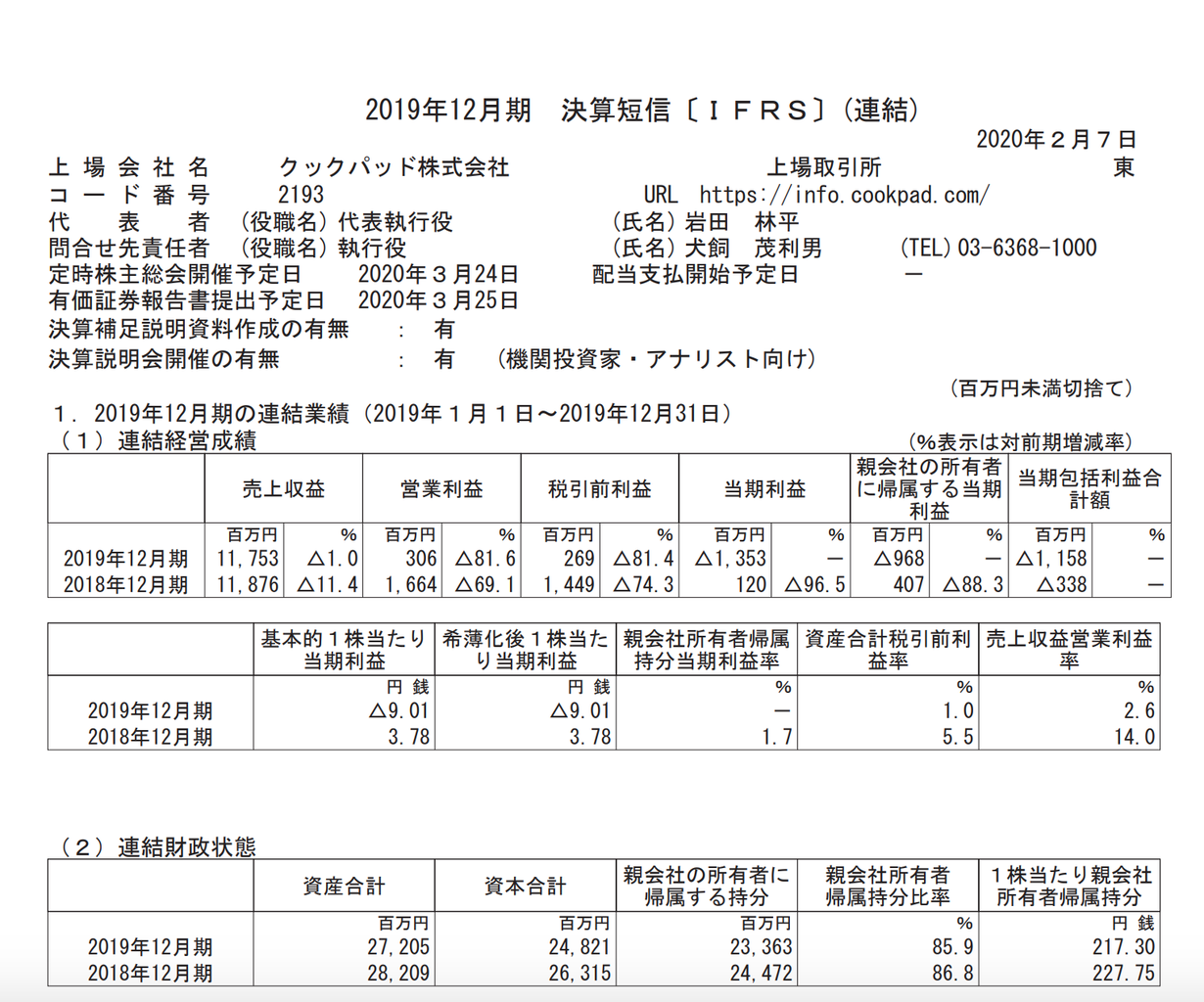 クックパッド 2019年12月期通期決算