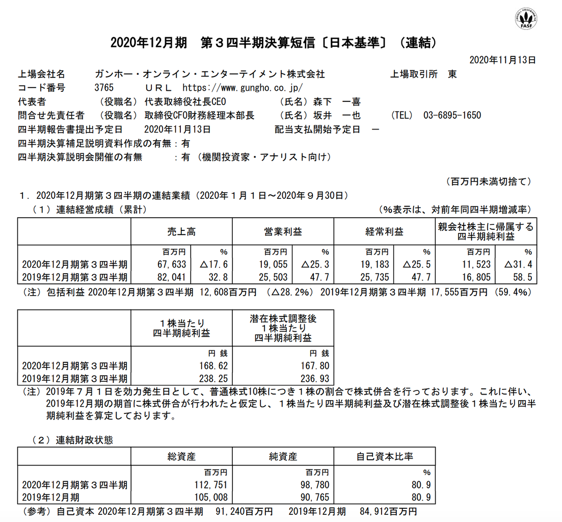 ガンホー・オンライン・エンターテイメント 2020年12月期第3四半期決算