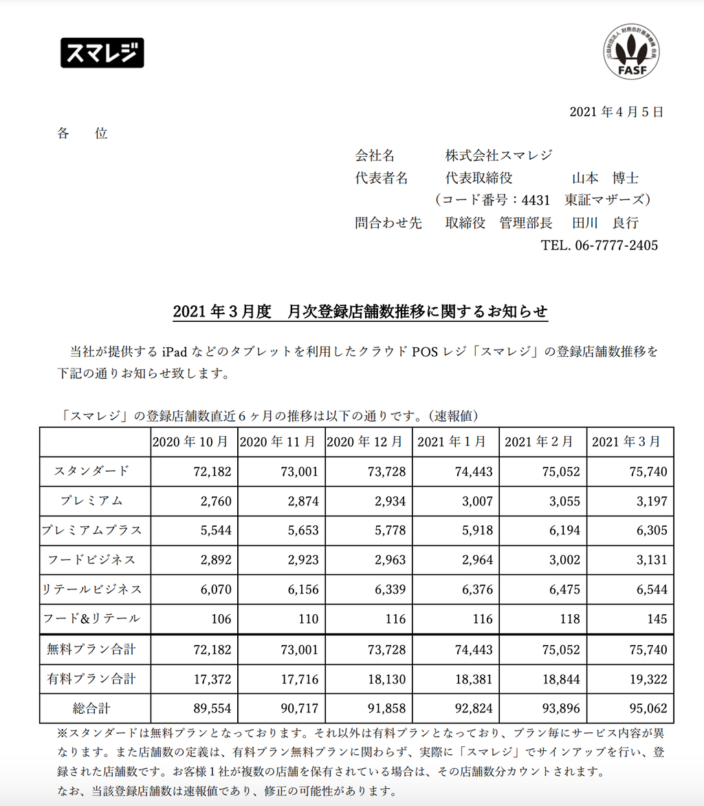 スマレジ 月次登録店舗数(2021年3月度)