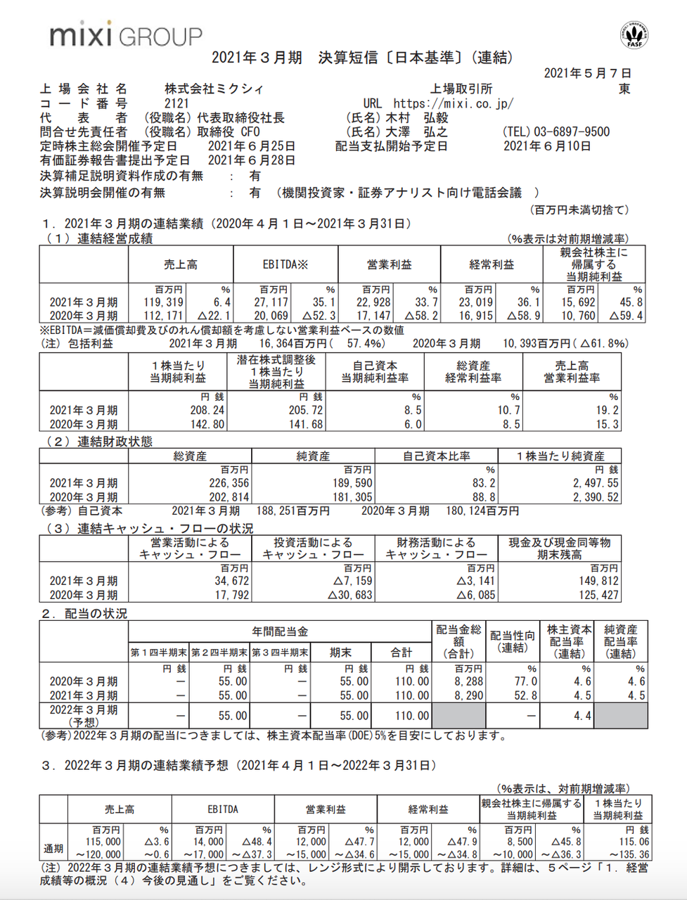 ミクシィ 2021年3月期通期決算