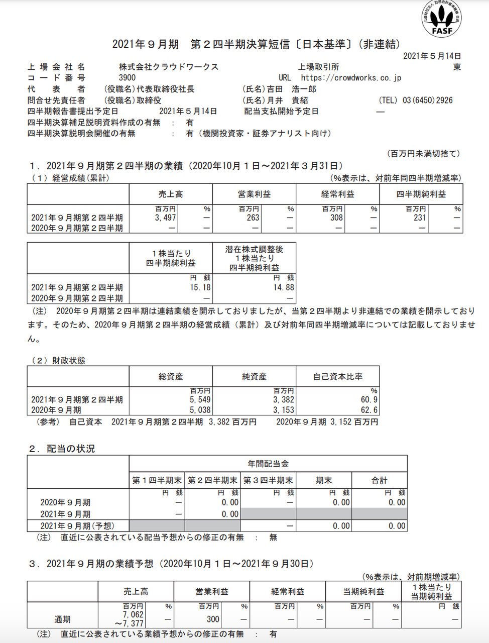 クラウドワークス 2021年9月期第2四半期決算