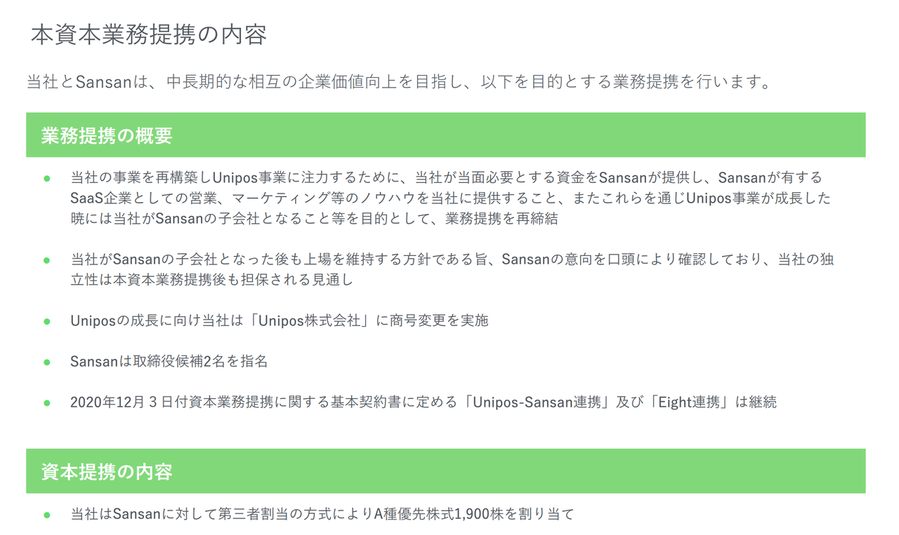 Unipos事業が成長した暁にはFringe81がSansanの子会社(上場は維持見込み)となること等を目的として、業務提携を再締結とのこと。