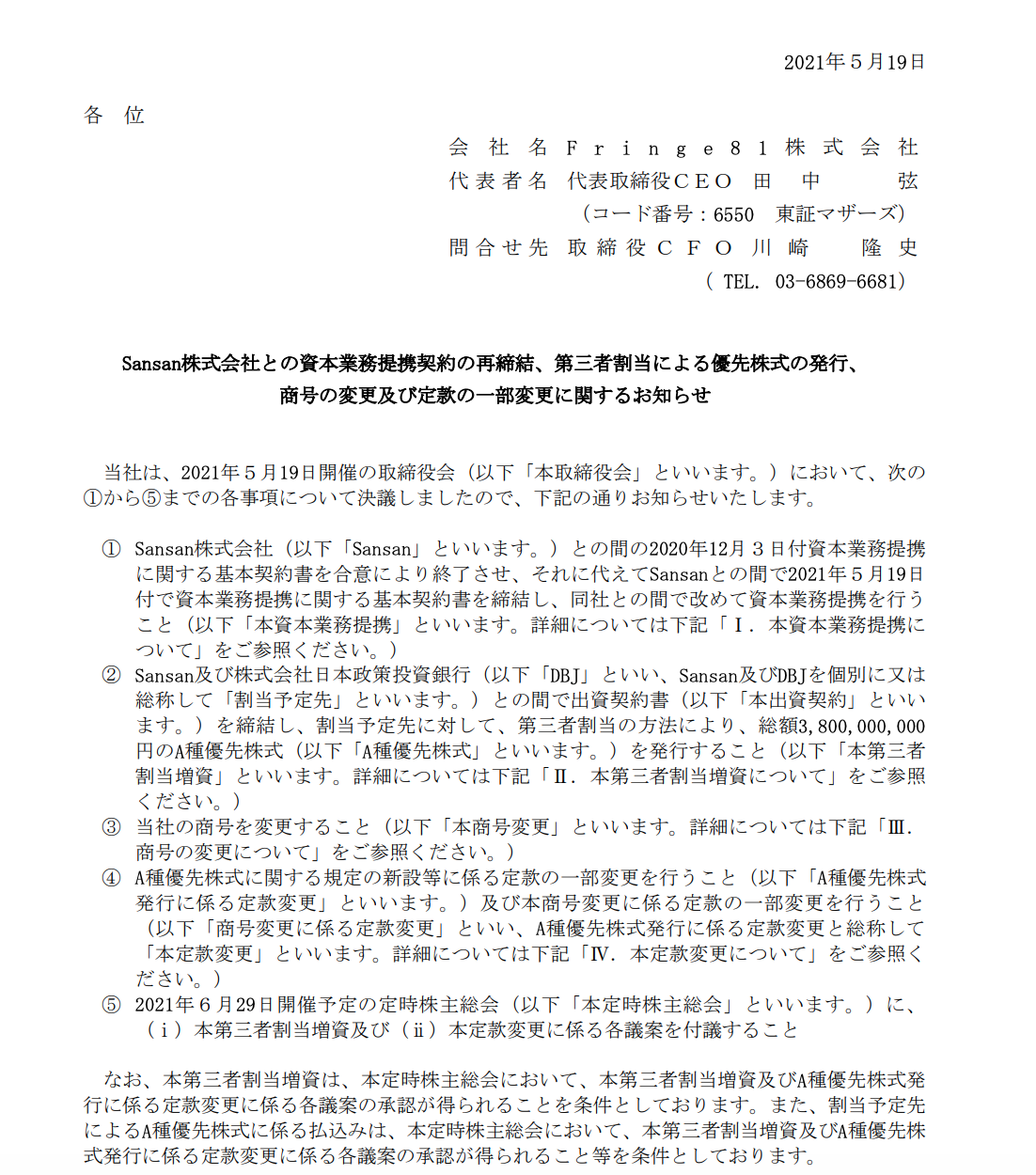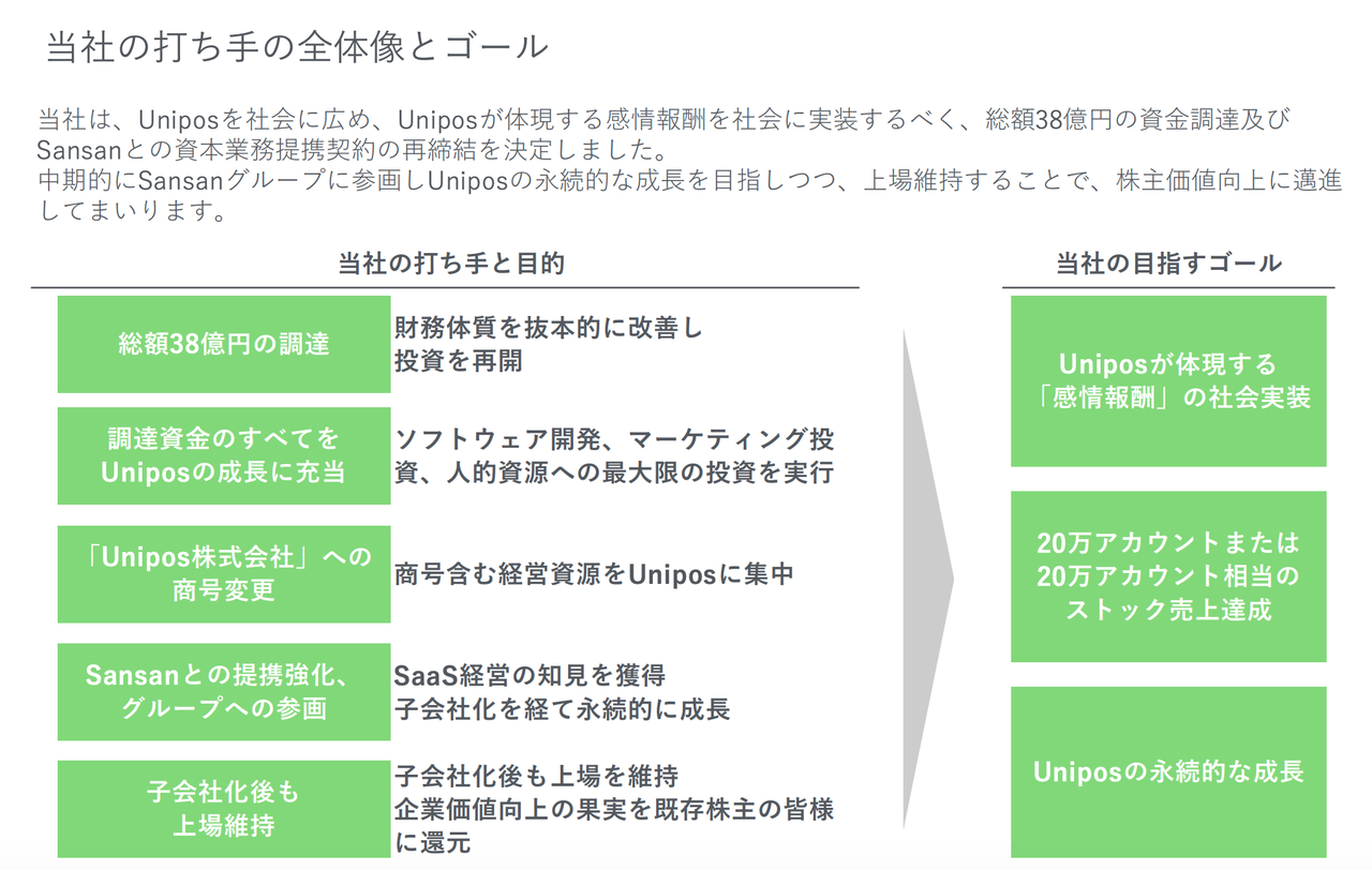 Fringe81がSansanとの資本業務提携契約の再締結を決議したと発表した。また、A種優先株式の第三者割当による総額38億円の調達とUnipos株式会社への商号変更も発表された。