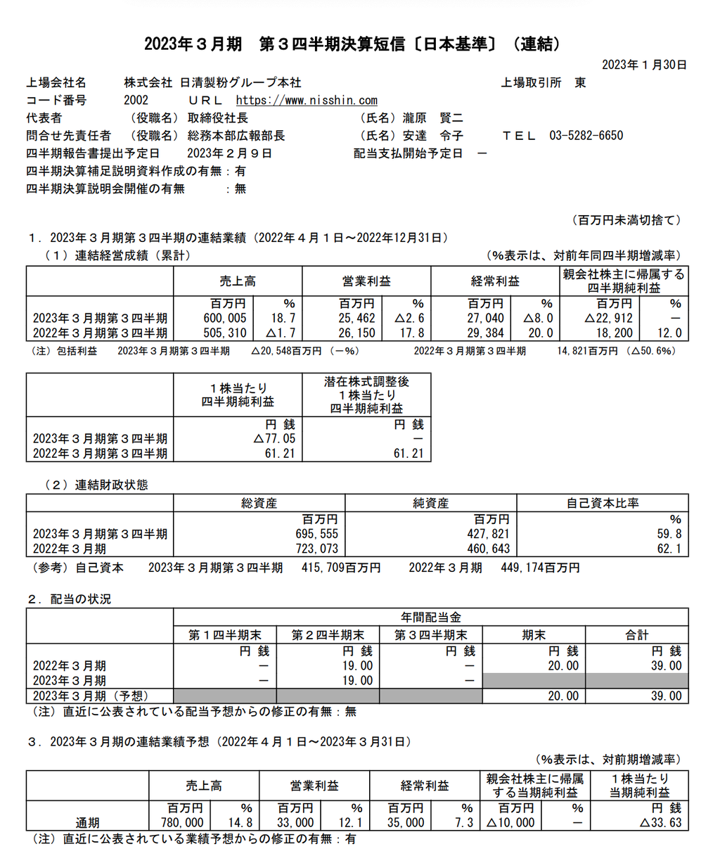 日清製粉グループ本社 2023年3月期第3四半期決算