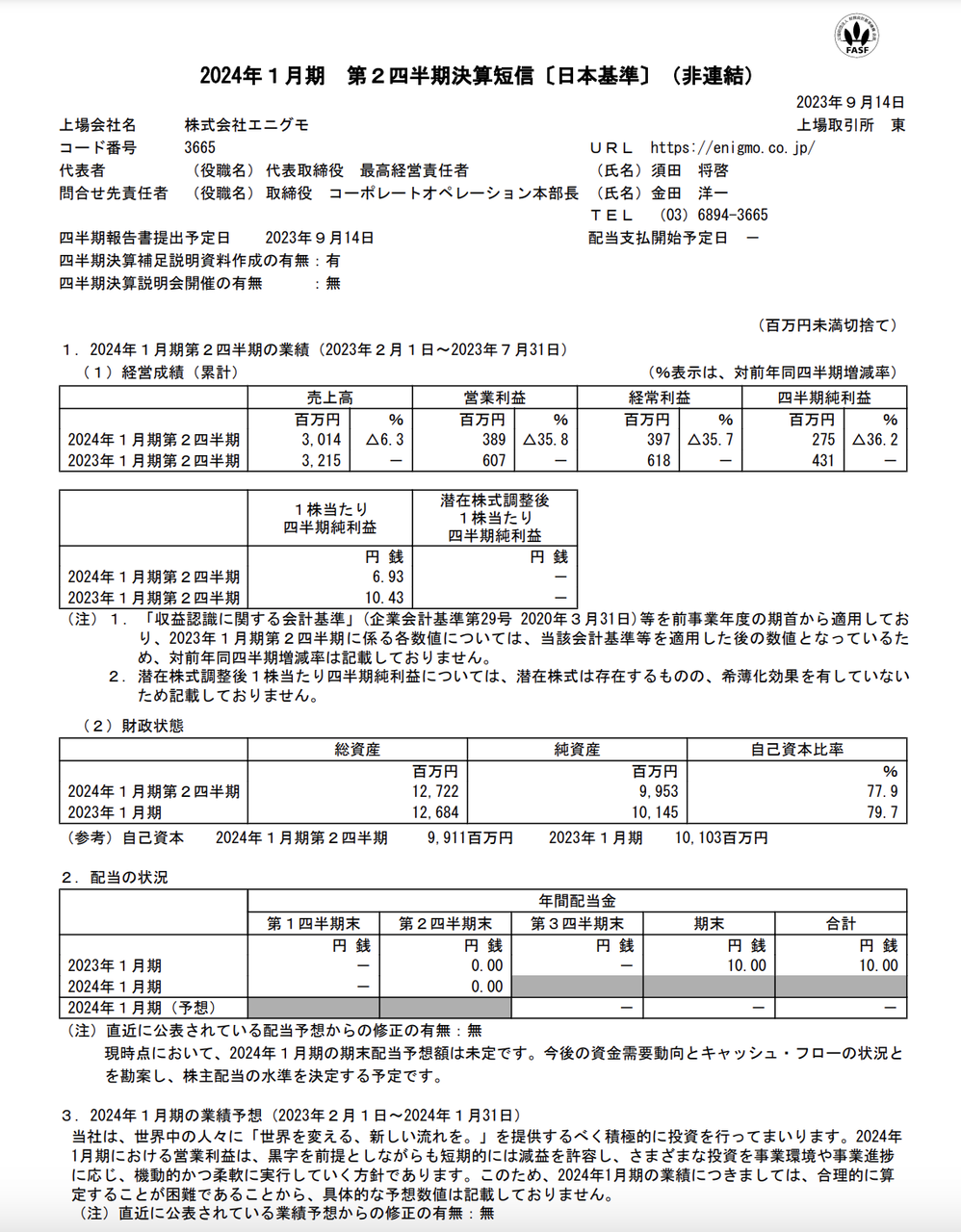 売上高:30億1400万円(前年同期比-6.3%)営業利益:3億8900万円(同-35.8%)経常利益:3億9700万円(同-35.7%)純利益:2億7500万円(同-36.2%)