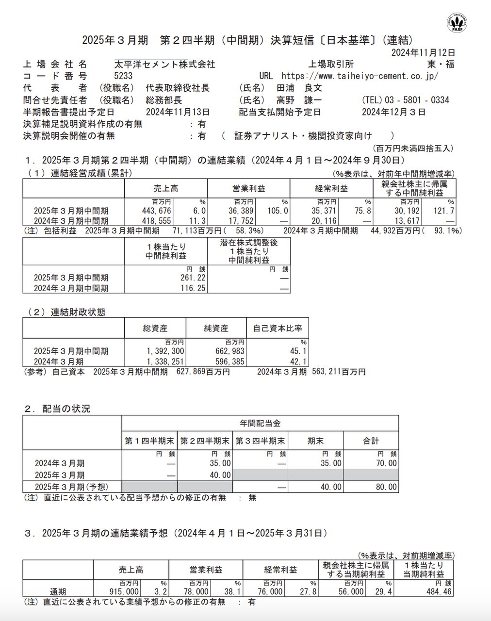 売上高:4436億7600万円(前年同期比+6.0%)営業利益:363億8900万円(同+105.0%)経常利益:353億7100万円(同+75.8%) 純利益:301億9200万円(同+121.7%)
