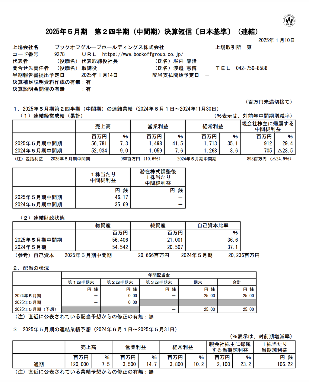 売上高:567億8100万円(前年同期比+7.3%)営業利益:14億9800万円(同+41.5%)経常利益:17億1300万円(同+35.1%)純利益:9億1200万円(同+29.4%)