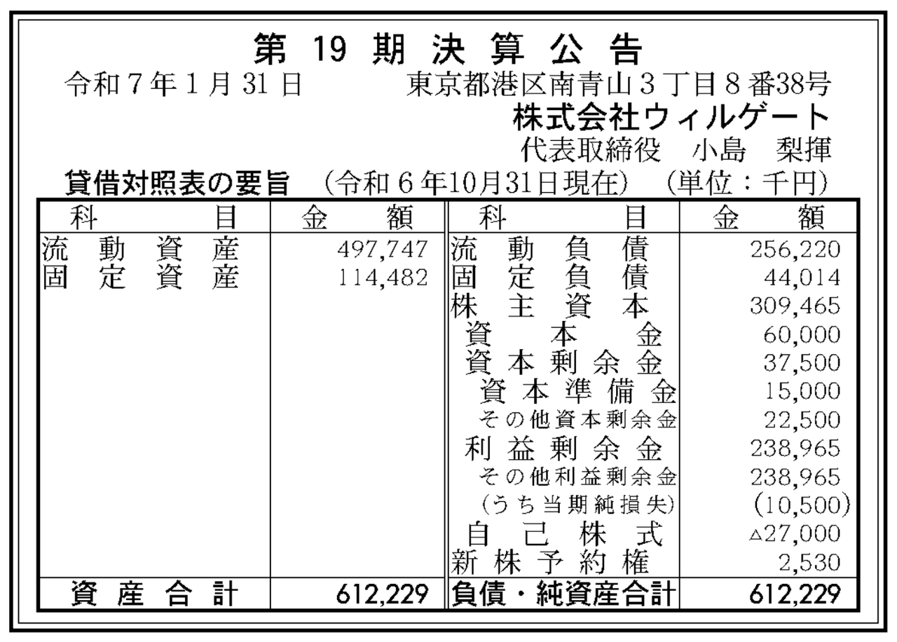 ウィルゲート 決算公告(第19期)