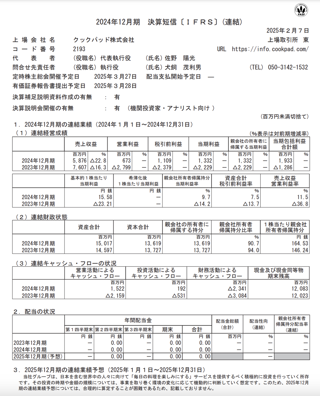 売上収益:58億7600万円(前年同期比-22.8%)営業利益:6億7300万円(前年同期は▲27億9900万円)純利益:13億3200万円(前年同期は▲22億2900万円)※IFRS