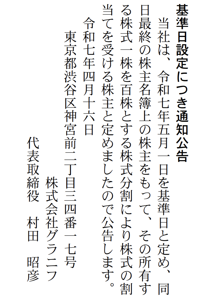 株式会社グラニフから株式分割公告が出ておりました。1株⇒100株へ