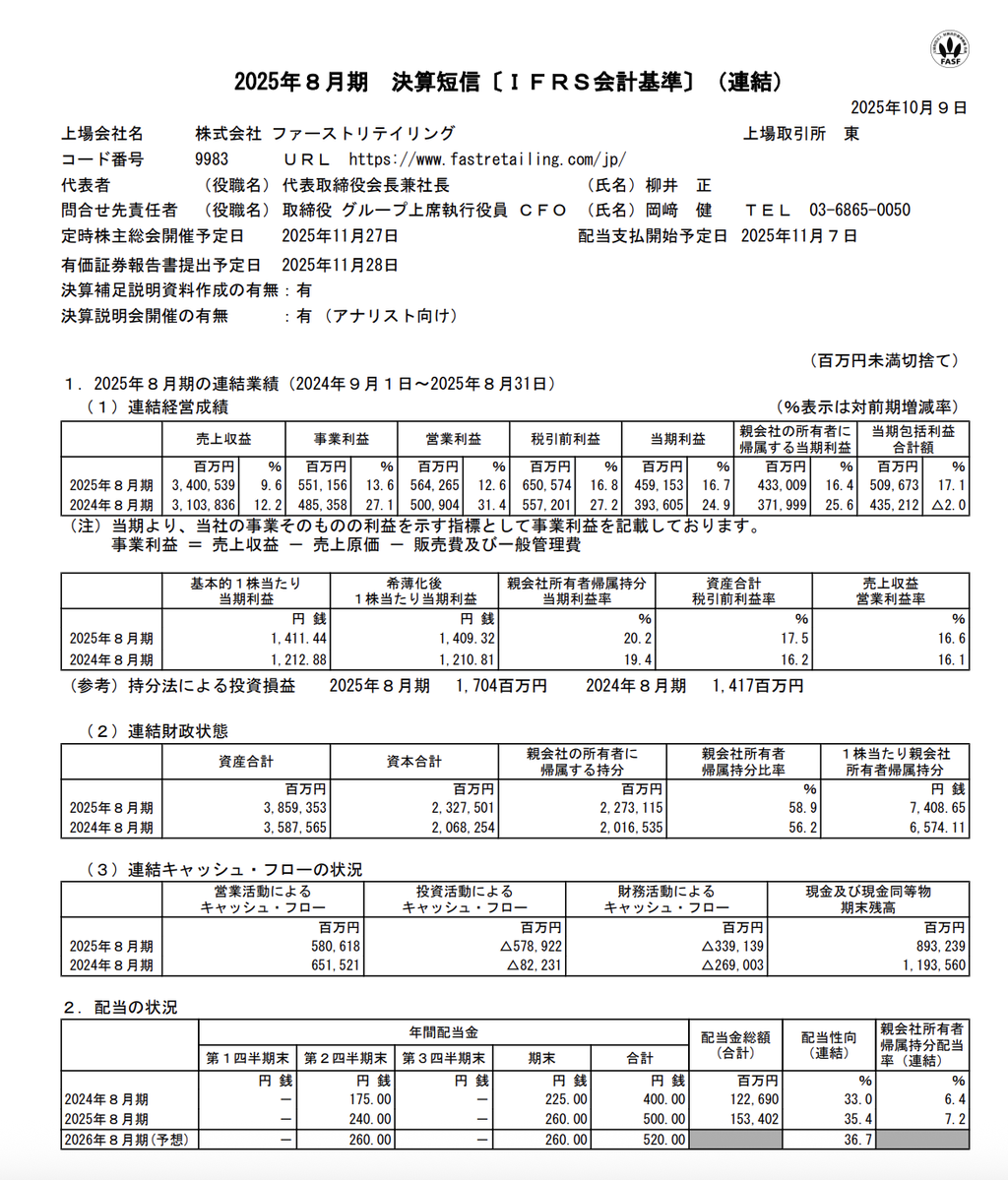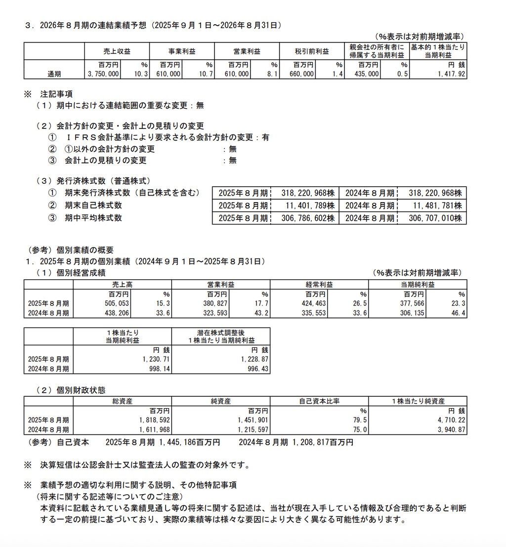 売上収益:3兆4005億3900万円(前年同期比+9.6%)営業利益:5642億6500万円(同+12.6%)純利益:4330億900万円(同+16.4%)※IFRS